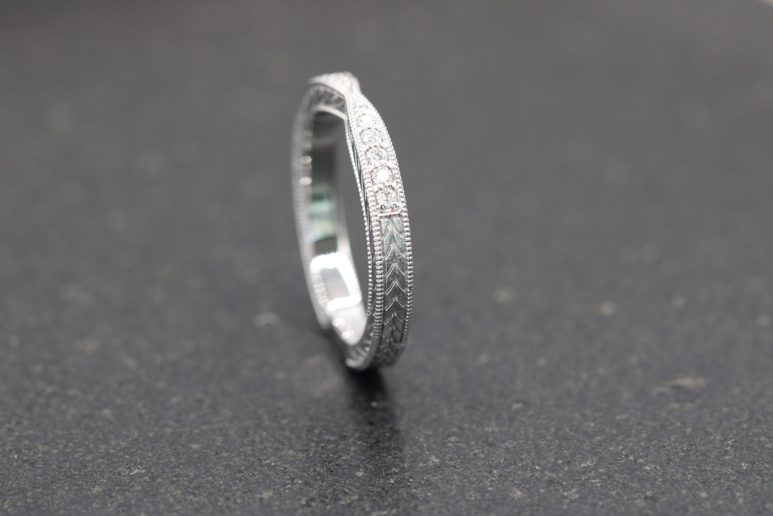 - Patterns – And then there is the option to engrave intricate and beautiful patterns on your wedding band. Engraved patterns can add detail and your unique personal style to your wedding band and there are many patterns to choose from such as bevelled edges, line patterns, channel cut patterns, textures, hammered and more. Below is just a few examples of stunning wedding rings with engraved patterns: