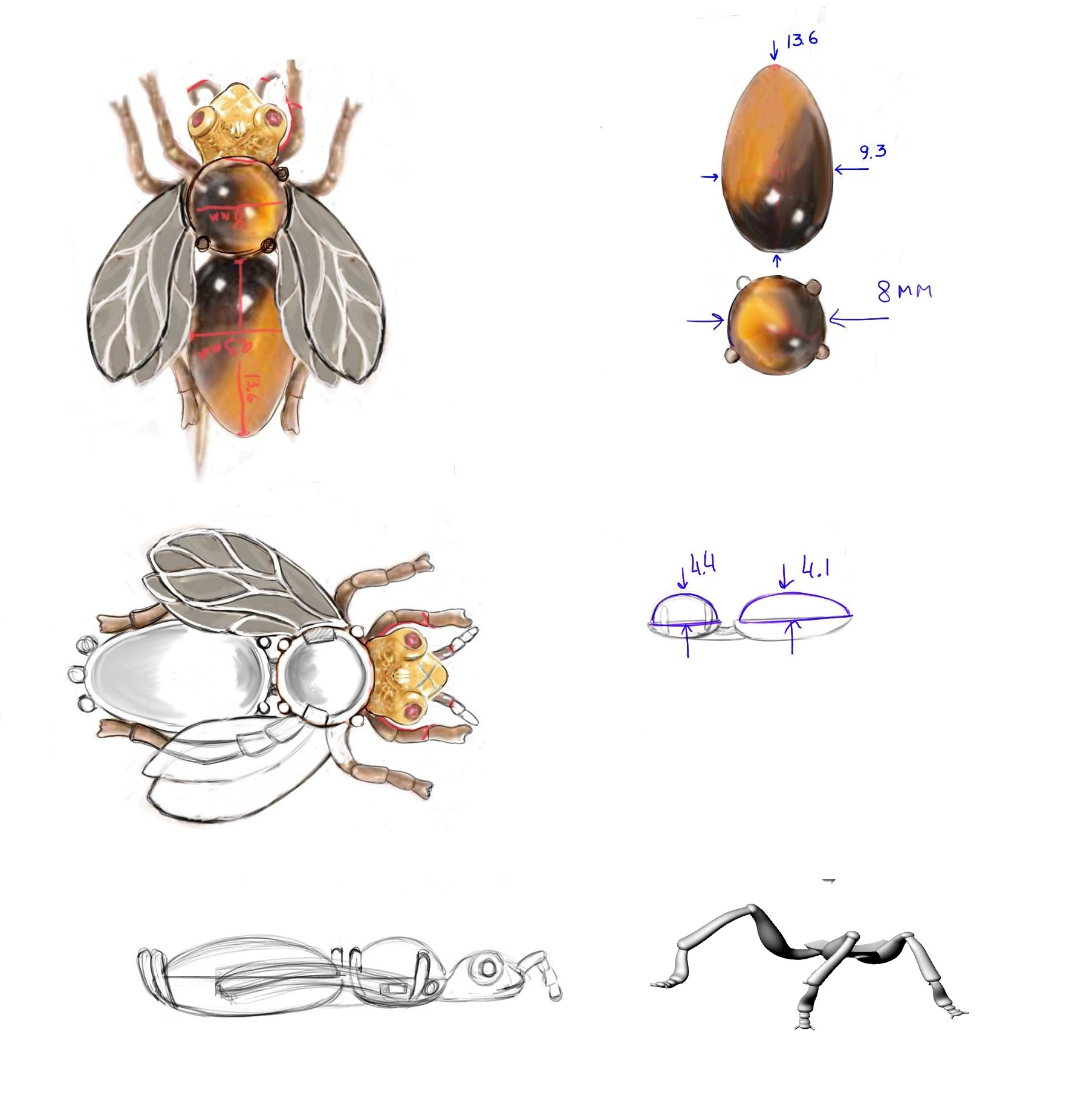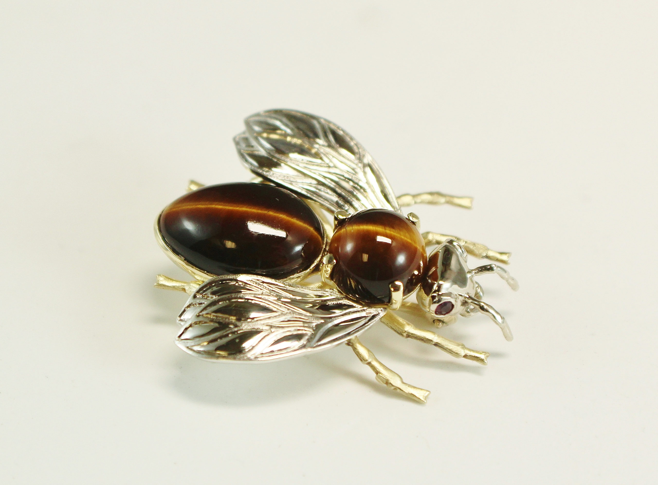 The customer that wanted this brooch originally saw another brooch in a photo and wanted one similar to the brooch that was in the photo, but with a more realistic head. The final piece made by Jewelrythis features patterned wings in white gold, a body and head as well as the legs in yellow gold, and ruby cabochons for the eyes.