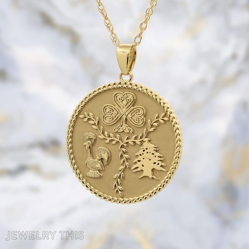The 1.25-inch pendant is crafted from 14kt yellow gold plated silver and features a rich, multi-textured finish. A soft matte background provides a beautiful contrast to the raised, high-polish symbolic elements—including a Celtic-inspired clover, a traditional rooster, and a cedar tree—all framed by an intricate braided border. It is a substantial, meaningful heirloom that transforms personal history into a wearable piece of art.