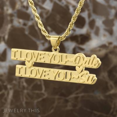 The pendant is crafted from 14kt yellow gold plated silver and measures approximately 1.75 inches in length. It features two tiered bars, each carrying the deeply meaningful phrase “I LOVE YOU,” followed by the names “Dale” and “Su.” The textured, matte background of the bars makes the polished, raised lettering and delicate heart accents truly stand out. Suspended from a sturdy gold rope chain, this bespoke piece is a beautiful example of how custom jewelry can turn a simple sentiment into a permanent, wearable memory.