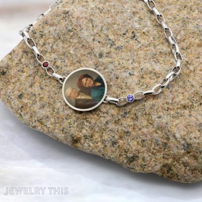 This beautiful custom silver bracelet honors the cherished memory of a beloved mother and father. Featuring a round photo-engraved charm showcasing a treasured portrait, the design is gracefully accented with garnet and tanzanite birthstone links, representing January and December. Crafted with care and thoughtful detail, this one-of-a-kind piece serves as a timeless tribute, allowing the wearer to keep their parents close to their heart every day. The elegant silver chain and personalized elements create a meaningful and lasting symbol of love and remembrance.