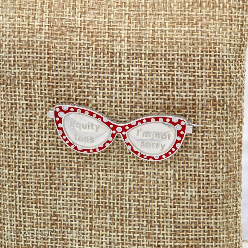 Meticulously handcrafted in sterling silver, this 2-inch wide pin features vivid red hot enamel contrasted with crisp white polka dots, bringing energy and charm to every outfit it accompanies. The lenses bear the engraved affirmations “Equity lens” and “I’m not sorry,” embodying empowerment and unapologetic conviction.