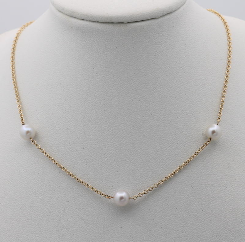 This custom jewelry necklace features three exquisite white 6mm Akoya pearls, each delicately stationed on a 16-inch 14K gold necklace, this piece is both classic and contemporary. The Akoya pearls are renowned for their lustrous and creamy white appearance, making them a popular choice for fine jewelry. The 14K gold necklace adds a touch of luxury, providing a strong and durable base that will ensure the necklace can be worn for years to come.