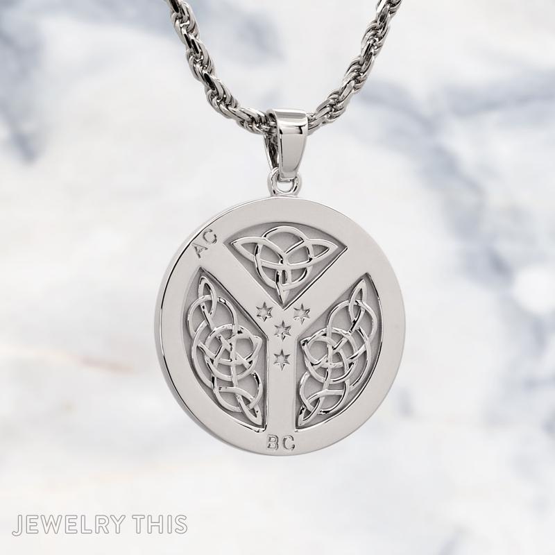 This striking custom pendant beautifully merges the iconic Celtic cross with elements inspired by the city of Chicago, symbolizing a unique blend of heritage and hometown pride. Crafted in sterling silver with a polished solid round background, the pendant features intricate dimensional Celtic knotwork and five stars central to the design. Personalized initials “AC” and “BC” are thoughtfully engraved to the side and bottom, with space reserved for future additions. Paired with a sleek 20-inch silver box chain, this piece exemplifies meticulous craftsmanship and heartfelt storytelling through wearable art.
