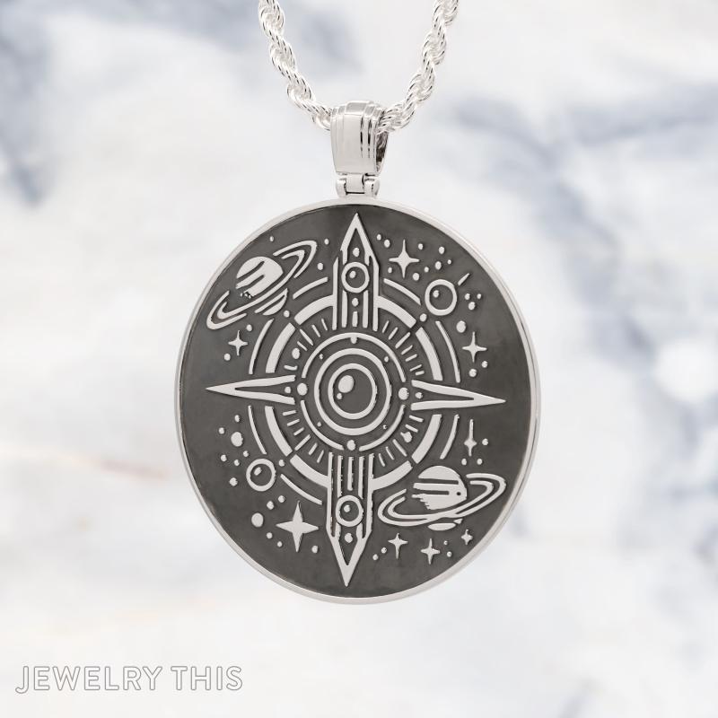 Discover the cosmic allure of this stunning pendant, expertly crafted in sterling silver with a striking black rhodium matte finish. The exquisite raised celestial design captures the mystery of a distant galaxy, while the 3-inch size makes a bold, unique statement. Paired with a sleek 5.5 mm sterling silver rope chain, this piece beautifully blends artistry with a relic-like, ancient vibe. Perfect for those who dare to wear their story and stand apart, this pendant invites you to carry the universe’s magic wherever you go. Own a piece as extraordinary as your journey.