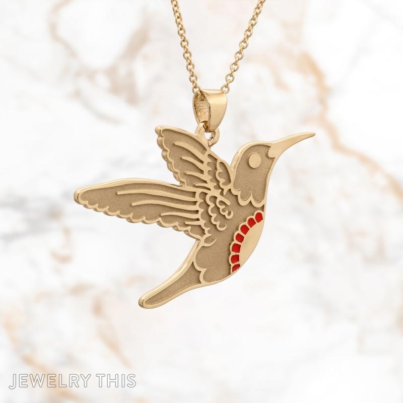 This captivating 10k yellow gold pendant captures the delicate beauty of a hummingbird, symbolizing hope and optimism. Featuring intricate detailing inspired by original artwork, the piece is accented with vibrant red enamel, reflecting the university’s colors. Crafted with precision and care, this meaningful pendant honors the inauguration of a new university president.