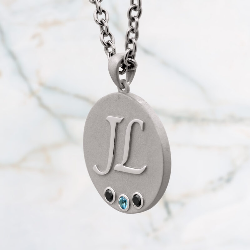 This beautiful sterling silver round pendant features initials prominently displayed on the front. Below the initials are three stones bezel set in a row, consisting of a blue topaz flanked by a black diamond on either side. On the backside of the pendant, a significant date is featured. The entire pendant is surrounded by a matte finish while the date and initials are high polish. The contrast of these finishes adds depth to the design.