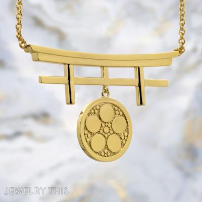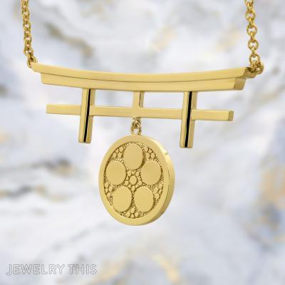 This double-sided pendant is a striking piece that beautifully blends cultural meaning with refined craftsmanship. Measuring 2.75 inches, it features two distinct family crests—each representing the heritage of the client’s wife—expertly rendered on opposite sides. The pendant’s structure evokes a gate, a symbol of transition and reverence, crafted in luminous 14kt yellow gold-plated silver. The detailed crests are framed within circular medallions that hang gracefully from the horizontal arch, creating balance and movement. With its elegant symmetry and deep personal significance, this pendant is both a meaningful tribute and a statement of timeless artistry.