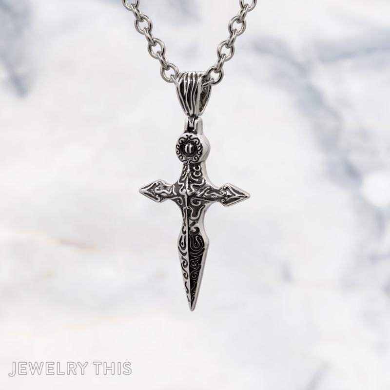 This exquisite pendant is a masterful blend of Nordic heritage and contemporary craftsmanship, meticulously crafted in 925 sterling silver. Measuring 1 inch in length (excluding the bail), it features a boldly textured design with a rich, dark patina that accentuates its rugged, antiqued character. The intricately detailed front showcases swirling motifs inspired by traditional Nordic artistry, while the reverse side is gracefully adorned with similar patterns, thoughtfully recessed to accommodate the elegant engraving of “Psalm 23” in a classic Gothic-inspired font.