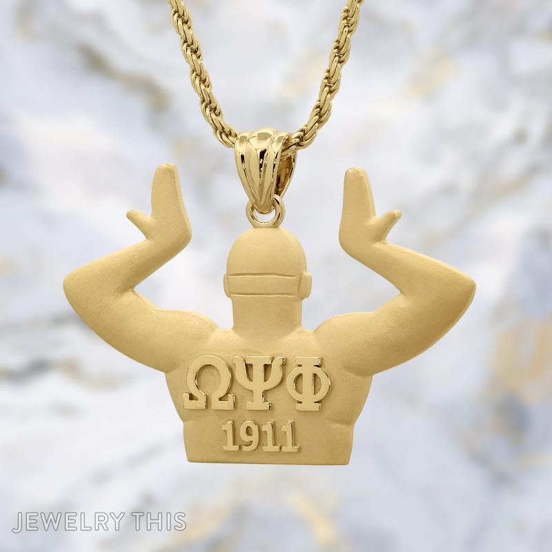 Standing 2 inches tall, the piece is meticulously crafted from 14kt yellow gold plated silver, featuring a sophisticated dual-finish that adds depth to its symbolism. The front displays a refined matte texture with the Greek letters ΩΨΦ and the historic 1911 founding year, while the reverse side transitions into a high-polish mirror finish. Engraved with the significant date 10.29.23, this pendant serves as a timeless heirloom that marks a specific milestone in a husband’s journey, making it a truly one-of-a-kind gift of recognition and love.