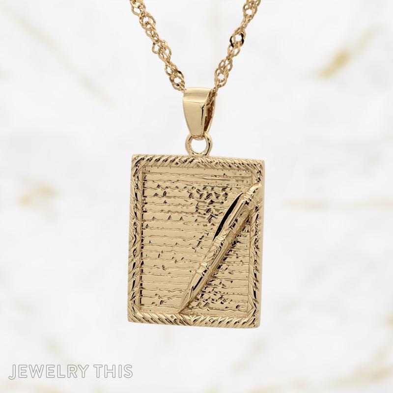 This pendant features a refined rectangular yellow gold frame with intricate Zulu-inspired border patterns, highlighting a three-dimensional pen resting over a textured background of flowing, scribble-like engravings. Crafted in 18k gold, this custom piece combines minimalist, futuristic design with cultural elements, creating a unique jewelry item that expresses creativity and personal meaning. Its carefully crafted details and balanced design make it a distinctive accessory that beautifully tells the wearer’s story.