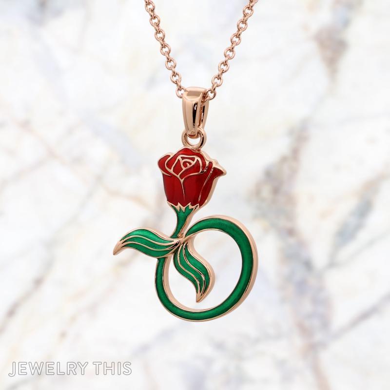 Discover a beautifully crafted pendant that merges the delicate elegance of a rose with the enchanting flow of a mermaid’s tail. Expertly crafted in 10K rose gold with vibrant red and green enamel accents, this 1-inch cut-out design captures your unique story with artistic flair. The smooth, glossy enamel brings depth and color, perfectly highlighting the pendant’s graceful curves. A stunning 18″ rose gold cable chain complements the piece, making it a wearable symbol of your favorite tales. This pendant is more than jewelry—it’s a heartfelt expression of your personal journey.