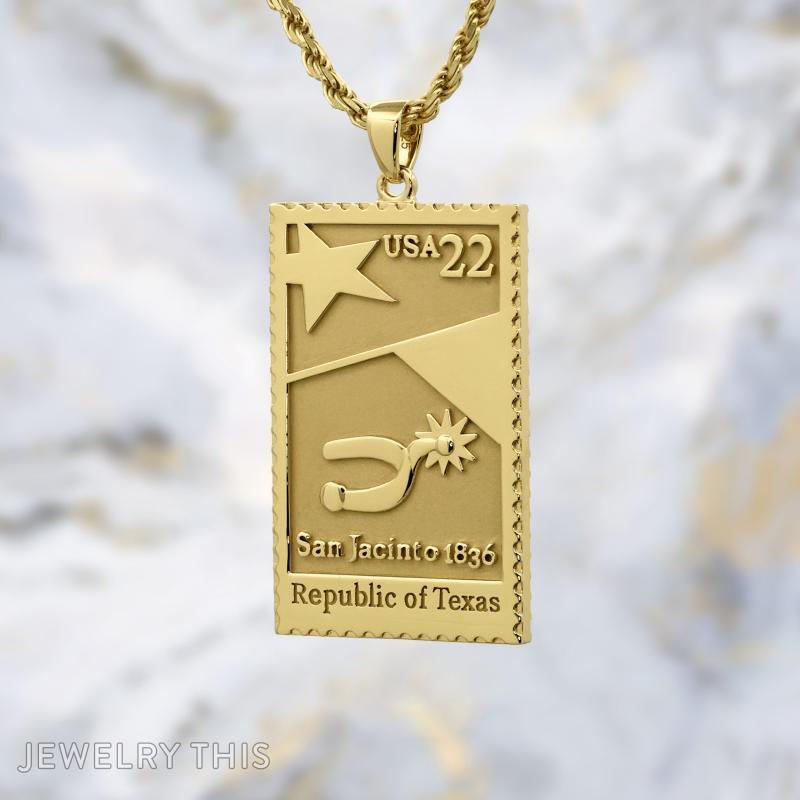 The 1.5-inch rectangular pendant is meticulously crafted from 14kt yellow gold plated silver, finished with a combination of textures that mimic the look of a vintage postage stamp. One side features a “Republic of Texas” design, complete with a lone star, a spur, and the historical “San Jacinto 1836” mark. The reverse side showcases a “Tennessee 1796” commemorative stamp, featuring the state capitol and the iconic statue of Andrew Jackson. With its intricate scalloped edges and high-polish raised details against a soft matte background, this piece is a one-of-a-kind tribute that turns a family name into a wearable work of art.