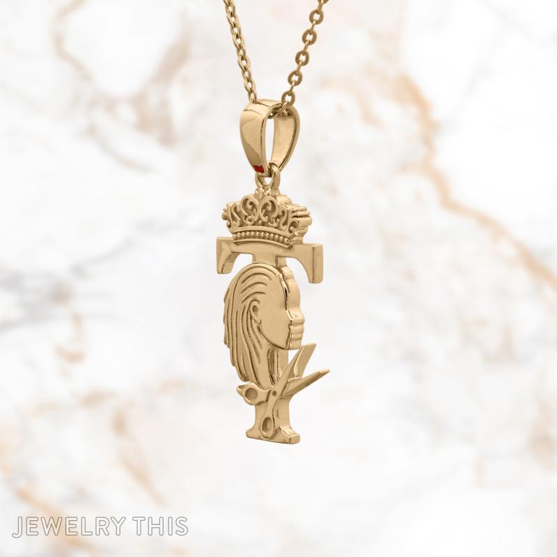 A celebration of professional artistry and personal identity, this custom pendant is a tribute to the craft of hair styling. The 1-inch design features a stylized letter “T” merged with a profile silhouette, accented by a pair of shears and topped with an ornate, filigree tiara. Crafted in 10kt yellow gold with a high-polish finish, this piece serves as a sophisticated emblem of a stylist’s dedication to their trade and the regal touch they bring to every client.