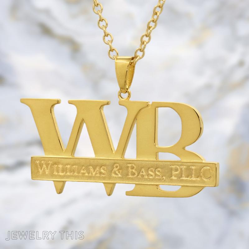 This stunning custom pendant features the bold “WB” logo of Williams & Bass, expertly crafted in yellow gold-plated silver with a stylish cut-out design. Measuring approximately 2 inches wide, it combines elegant craftsmanship with personalized engraving for a distinctive, one-of-a-kind piece. The matte finish on the engraved bar adds a refined contrast, enhancing the pendant’s unique character.