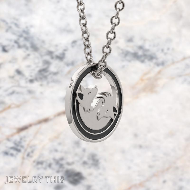 This custom pendant captures the harmony of yin and yang through the graceful forms of two intertwined foxes. Crafted in sterling silver and measuring a delicate 20mm, the design features a thoughtfully cut-out section on the right side to allow a unique chain integration. Black rhodium accents highlight key details—such as the foxes’ ears and inner circles—adding depth and character. Meticulously handcrafted and double-sided, this pendant is a meaningful, one-of-a-kind piece that beautifully blends symbolism with elegant craftsmanship.