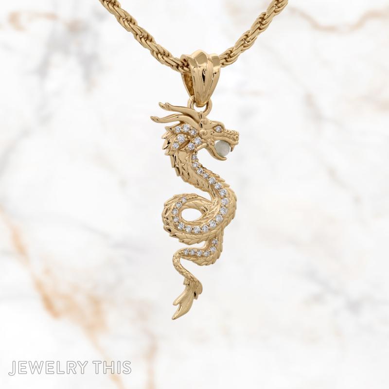 This enchanting Year of the Dragon pendant tells a powerful story of strength and tradition. Crafted in luminous 14K yellow gold with delicate white rhodium accents, it features expertly set sparkling lab-created diamonds that trace the dragon’s scales in stunning detail. At its heart, a genuine 2.5 mm jade bead rests in the dragon’s mouth, symbolizing wisdom and good fortune. With an elegant 1.5-inch length and a gracefully curling tail, this unique piece blends artistry and cultural symbolism—perfect for everyday wear or as a meaningful heirloom that celebrates your personal journey.