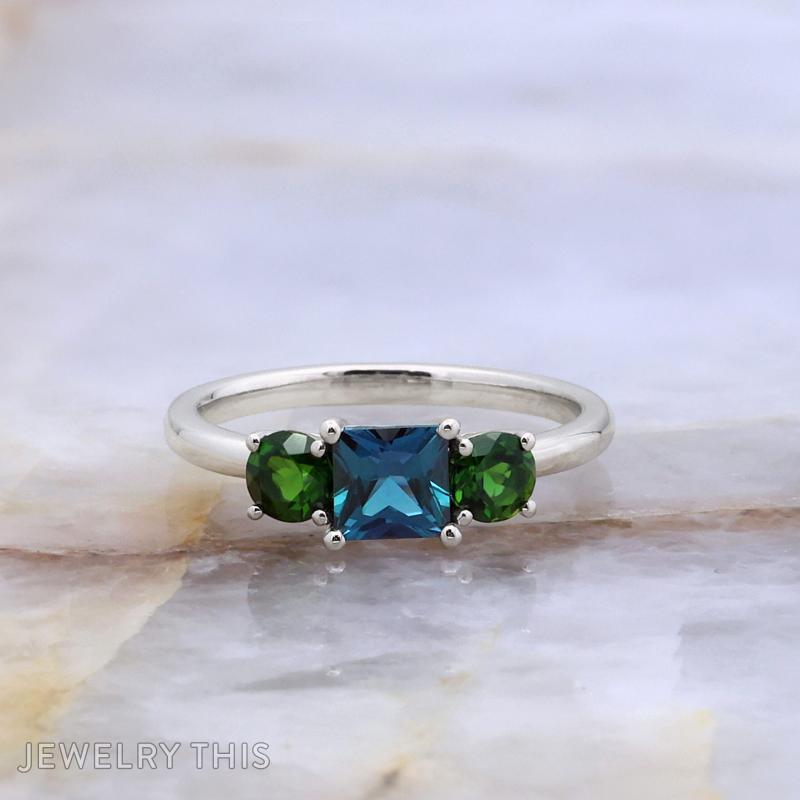 The ring is expertly crafted from solid 14kt white gold with a slender, high-polish band that allows the vibrant gemstones to take center stage. At the heart of the design is a princess-cut lab-created alexandrite, known for its remarkable ability to shift hues in different lighting. This center stone is flanked by two brilliant round green tourmalines, chosen to represent their son’s birthstones. It is a bespoke heirloom that balances sophisticated color with deep personal meaning, creating a piece that is as unique as the story it tells.