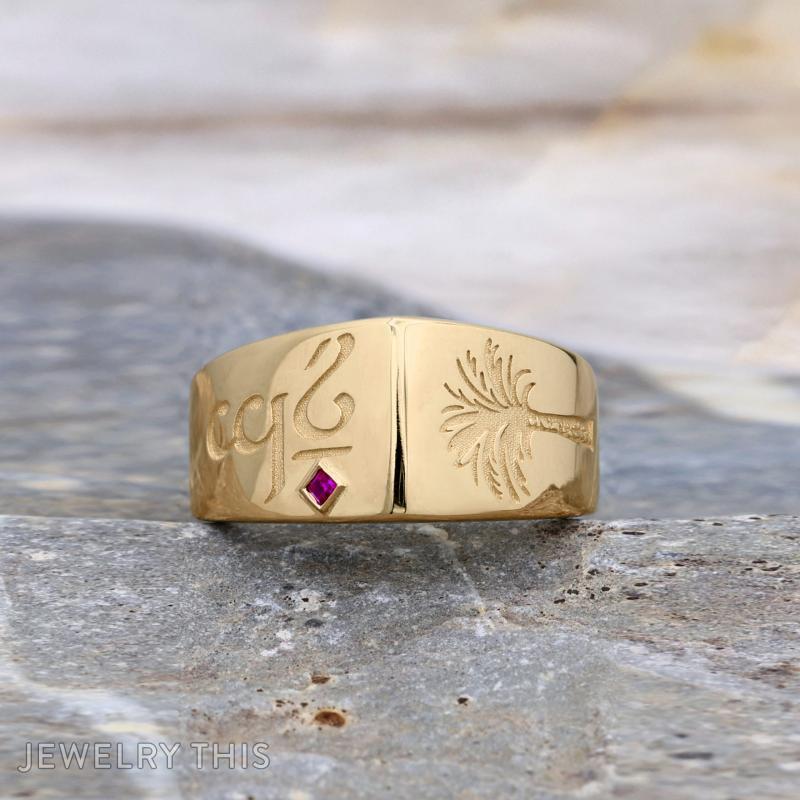 A deeply personal expression of a wife’s love for her husband, this custom signet ring is designed to tell a unique story. The face of the ring features intricate, sandblasted Elvish script paired with a detailed palm tree engraving, accented by a vibrant, princess-cut lab-grown ruby set in a diamond orientation.