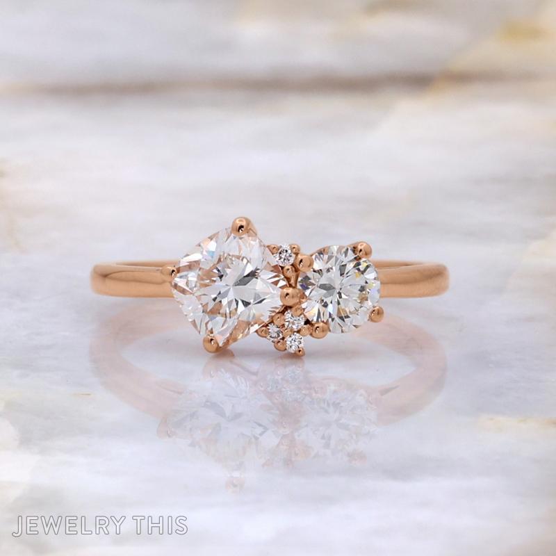 This exquisite rose gold ring is a beautiful testament to sustainable luxury, masterfully reimagined using diamonds from the client’s own cherished collection. The design features a modern “Toi et Moi” inspired silhouette, showcasing two prominent center stones: a brilliant cushion-cut diamond and a classic round brilliant-cut diamond. Uniting these two primary gems is a delicate, organic cluster of smaller round diamonds, adding a sophisticated texture and an asymmetrical flow to the design. The warm, romantic glow of the rose gold setting provides a stunning contrast to the crisp brilliance of the repurposed diamonds. By breathing new life into heirloom stones, this ring serves as a timeless bridge between past memories and a beautiful new beginning.