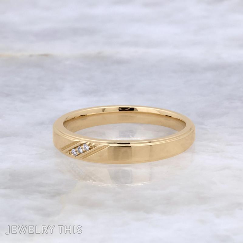 The ring features a gently tapering band that narrows delicately from 4mm to 3mm, perfectly balancing subtlety with presence. Expertly engraved diagonal lines frame three sparkling small lab diamonds, aligned with precision to create an understated yet captivating focal point. The edges are softly rounded, enhancing comfort and adding a refined softness to the geometric lines that define the design.