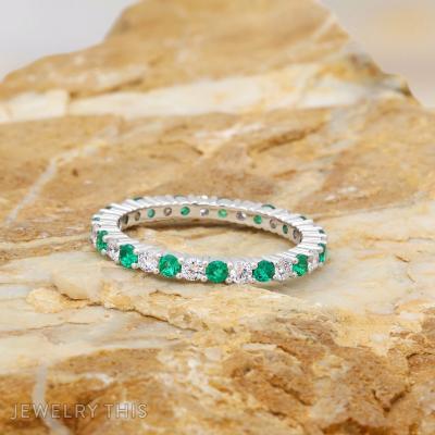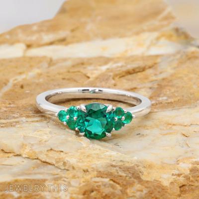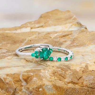 This elegant white gold wedding set features a vibrant round brilliant-cut lab-grown emerald at the center of the engagement ring, radiating vibrant green color. On each side of the center stone, a cluster of three smaller round emeralds forms a delicate triangular grouping, adding symmetry and charm to the design. The matching wedding band complements the engagement ring perfectly, with alternating round brilliant lab-grown diamonds and emeralds encircling the entire band in a continuous pattern of sparkle and vivid green. Together, the two rings create a harmonious balance of brilliance and color.