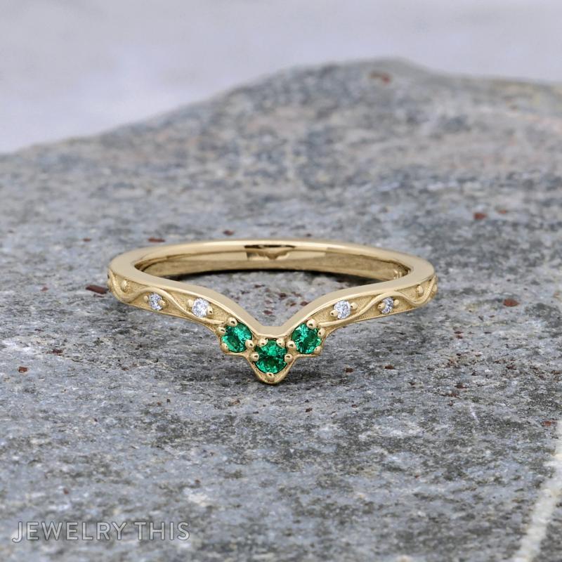 This exquisitely crafted 14K yellow gold wedding band is designed with a graceful V-shaped contour, allowing it to nestle perfectly flush against the side of an existing engagement ring . The band features a delicate, swirling vine engraving and a subtle, textured matte background. At the center of the “V” are three vibrant, round lab-grown emeralds, providing a lush pop of verdant color. These are flanked by shimmering round lab-grown diamonds, which are bead-set into the flowing gold pattern for a continuous dance of light. This band is a stunning blend of nature-inspired artistry and refined, ethical luxury.