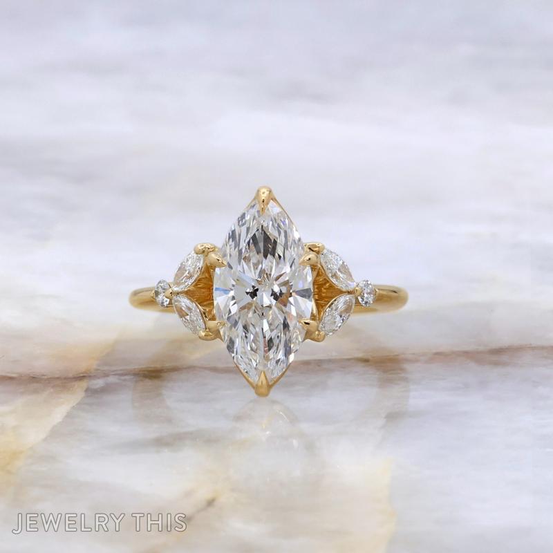 This breathtaking yellow gold engagement ring is a masterclass in asymmetrical, nature-inspired design. At its center, a magnificent marquise-cut lab-grown diamond is held in a sleek, protective Lotus-prong setting that accentuates its elongated, elegant silhouette. The center stone is flanked by a captivating cluster of marquise and round lab-grown diamond accents, arranged in a floral-like “sunburst” pattern that radiates outward along the shoulders. The polished yellow gold band features a delicate tapered profile, drawing the eye directly to the brilliant composition of stones. Combining bold geometry with organic details, this ring is a sophisticated and ethical choice for a modern romance.