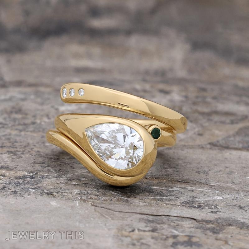 This breathtaking yellow gold wedding set is a masterclass in organic, bypass-style design. The engagement ring features a brilliant pear-shaped diamond encased in a sleek, protective bezel. The bezel setting flows into a substantial, liquid-gold arm that hovers above the center stone, creating an open-cuff design. Three flush-set diamonds are set into the tip of this arm. The set is enhanced by a matching contoured band that nestles perfectly along the engagement ring’s bottom curves. Tucked intimately into the side of the band is a single, round blue topaz, offering an unexpected pop of color. Together, these pieces create a harmonious, high-fashion silhouette that feels both solid and gracefully fluid.