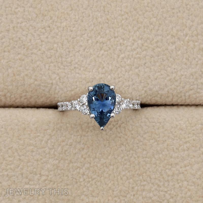 This exquisite white gold engagement ring captures the deep, enchanting beauty of the sea. The centerpiece is a stunning pear-cut blue-green sapphire, held in a prong setting that accentuates its elegant teardrop silhouette and rich, velvety hue. Flanking the sapphire are clusters of shimmering lab-grown diamond accents, meticulously arranged to create a graceful transition into the band. The polished white gold shank is further elevated by a half-eternity row of pavé-set diamonds, ensuring brilliant sparkle from every angle. Combining a sophisticated color palette with a classic, feminine shape, this ring is a timeless symbol of devotion and refined taste.