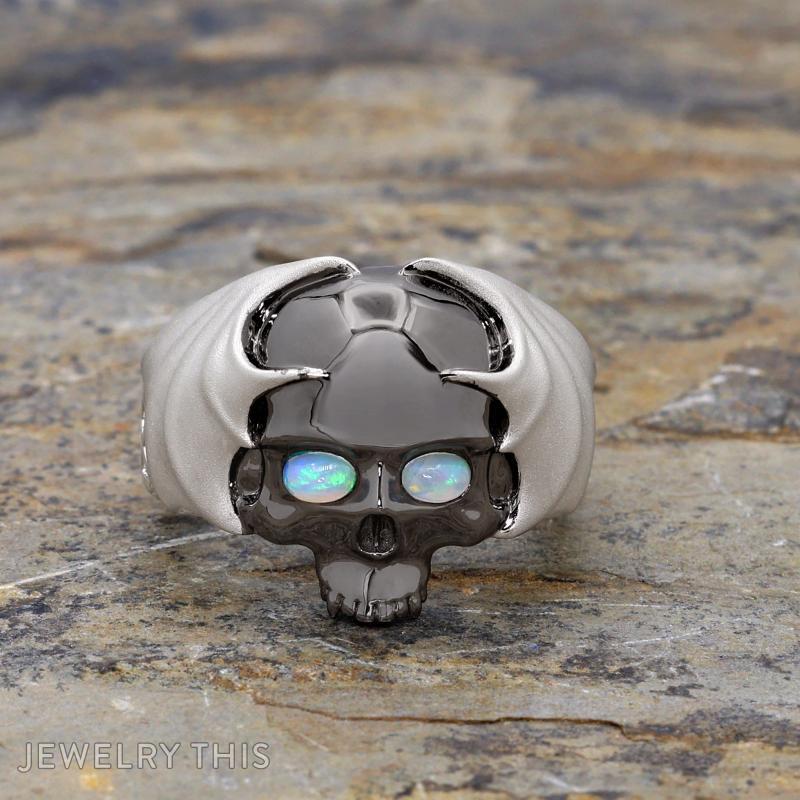This sterling silver ring is a masterful fusion of dark romanticism and intricate detail. At its heart is a black rhodium-plated skull, which serves as a dramatic, high-contrast focal point against the bright silver. The skull’s hollowed eyes are set with iridescent oval opals, which cast a mystical, ethereal glow. Deepening the gothic narrative, matte-finished bat wings wrap protectively around the skull, fluidly transitioning into delicate spiderweb filigree along the band’s shoulders. For a hidden touch of vibrant color, a small ruby is tucked discreetly beneath the skull’s jaw. With its complex textures and symbolic depth, this ring is a powerful statement piece for those drawn to the macabre and the mysterious.