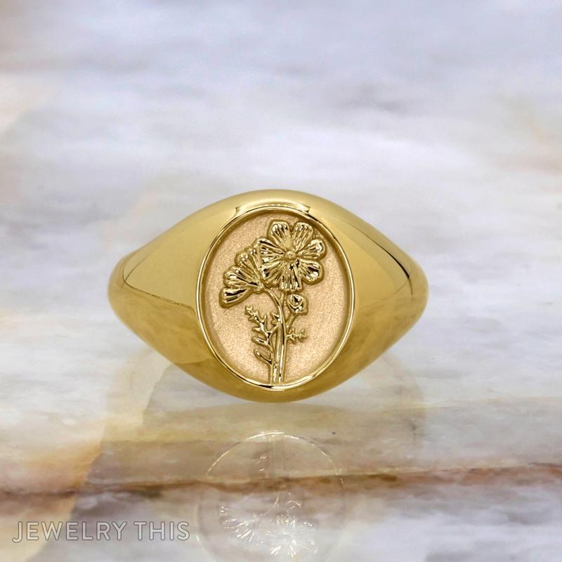Made from 14K gold-plated sterling silver, the ring balances durability with elegance, featuring a refined oval face measuring approximately 11 x 9 mm—perfectly sized to complement the wearer’s hand with subtle sophistication. The cosmos flower design is highlighted with a high-polish finish, contrasting beautifully against a matte background to enhance the intricate details. This piece combines timeless craftsmanship with meaningful symbolism, making it a unique expression of success, celebration, and personal style.