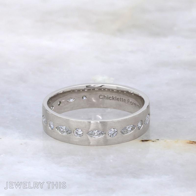 This stunning custom ring tells the heartfelt story of enduring love, crafted in luminous 14K white gold. Expertly set with dazzling lab-created diamonds—all perfectly matched in D or E color—featuring a captivating mix of marquise and round cuts that shine brilliantly across the band. The comfort-fit design ensures a smooth, polished interior for everyday wear, while the exterior boasts a flawless satin finish that beautifully complements the sparkling stones. Designed with meticulous attention to detail, this ring is a timeless symbol of commitment and elegance, ready to be worn and cherished forever.
