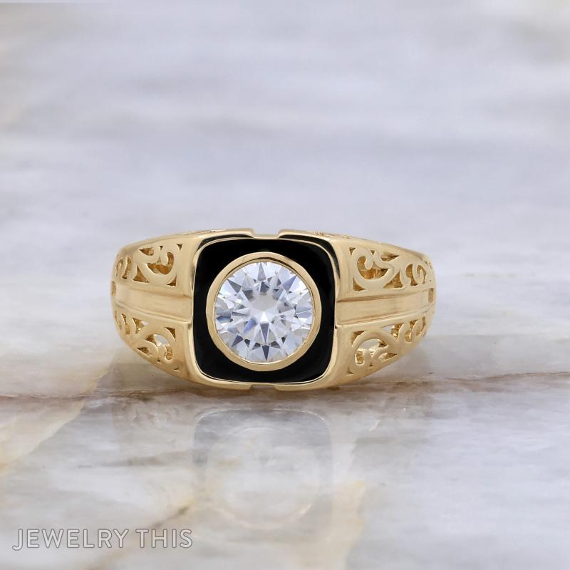 At its center, a magnificent 8mm round Moissanite is showcased within a protective bezel setting, offering exceptional fire and brilliance. This central stone is framed by a striking black enamel inlay set within a soft-cornered square halo, creating a dramatic visual “pop” that emphasizes the gem’s clarity. The design is further detailed with polished horizontal bands and small notched accents on the top and bottom of the face, balancing the ornate filigree with structured, contemporary elements. This piece is a masterclass in using contrasting textures and colors to create a truly one-of-a-kind presence on the hand.