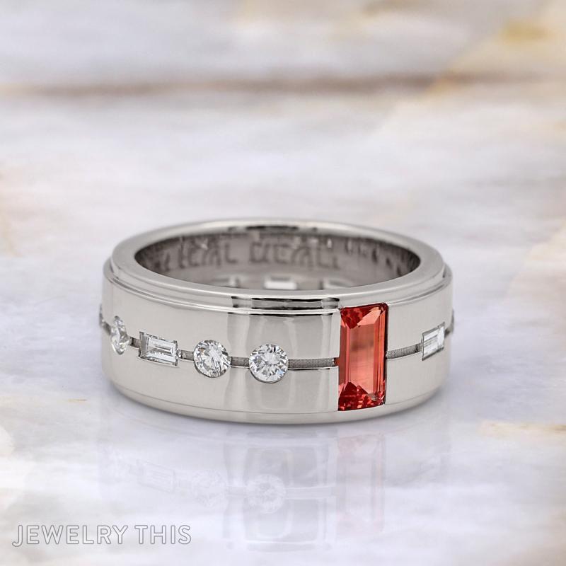 This innovative 18-karat white gold band is a brilliant fusion of modern geometry and deeply personal storytelling. At its heart sits a vibrant, emerald-cut lab-grown orange sapphire, held in a sleek channel setting that allows its fiery brilliance to take center stage.