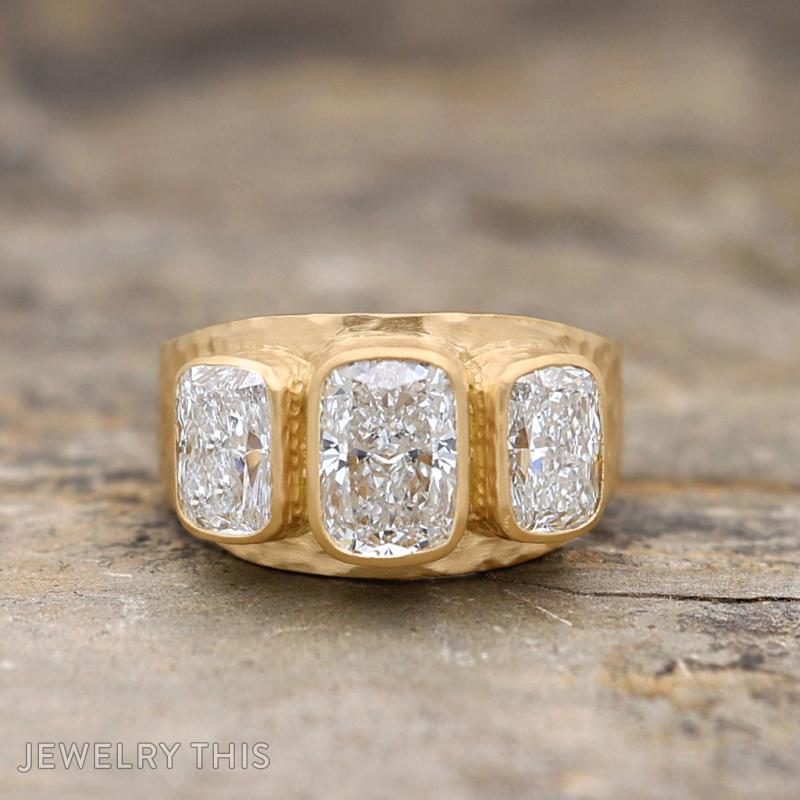 This striking 18-karat yellow gold band reimagines the classic three-stone silhouette with a bold, artisanal edge. The use of higher-karat gold provides a rich, deep yellow hue that perfectly complements the ring’s substantial design. Centered in the piece is a trio of elongated cushion-cut lab-grown diamonds, each meticulously secured in a low-profile bezel setting to create a continuous wall of brilliant light. The wide band is defined by its distinctive hammered finish, offering a rugged, hand-forged aesthetic that catches the light in a soft, organic way. This textured surface provides a sophisticated contrast to the high-polished bezels and the crisp fire of the diamonds. Combining structural strength with a unique tactile quality, this ring is a powerful statement of modern luxury and enduring craftsmanship.