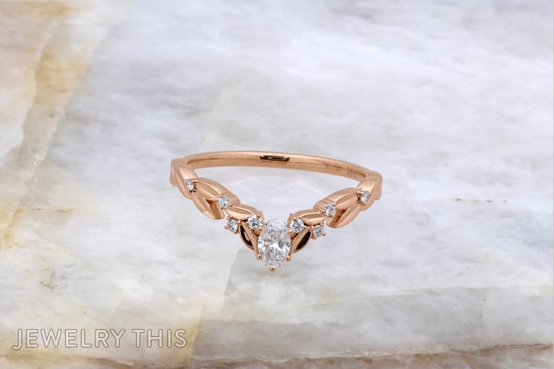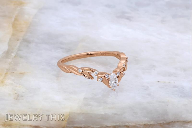 This custom rose gold wedding band was thoughtfully designed to rest gracefully against an existing engagement ring, creating a seamless and complementary pairing. The band features an elegant arrangement of sculpted leaves that climb up the sides, bringing a natural and organic beauty to the design. Its curved silhouette is carefully shaped to fit snugly alongside the engagement ring. At the center of the curve lies a sparkling oval diamond, mirroring the large oval diamond of the engagement ring for perfect harmony. Scattered among the leaves, small round diamonds add a delicate shimmer, enhancing the ring’s intricate details.