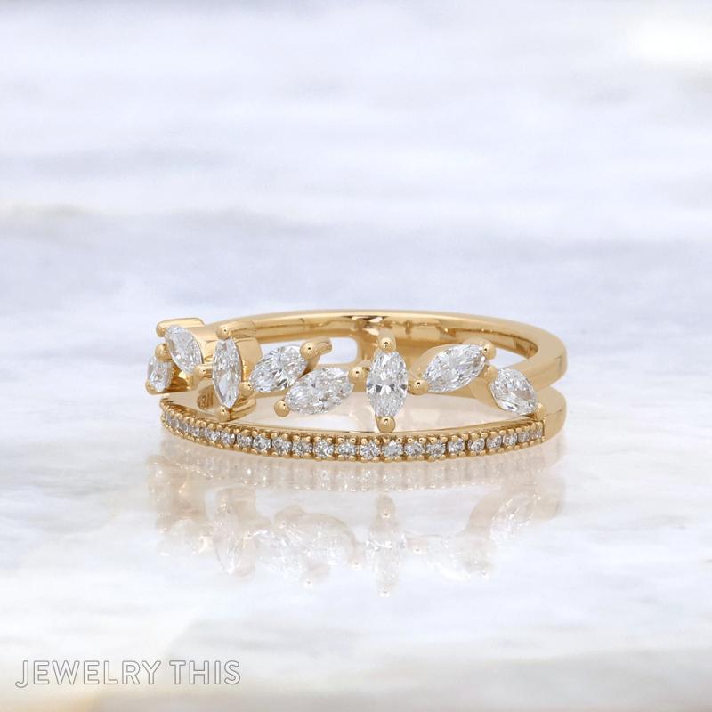 Adorning the ring are eight marquise-cut lab-grown diamonds, artfully set to mimic the organic arrangement of leaves, symbolizing growth and a flourishing bond. Complementing these are twenty-five brilliant round-cut lab-created diamonds, lining one of the bands with sparkling finesse that catches the light from every angle, adding a refined touch of glamour.