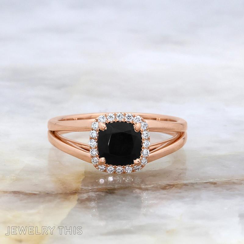 The setting is crafted from polished rose gold, featuring a unique split-shank design that creates an airy, architectural feel on the finger. The warm, romantic tones of the rose gold beautifully complement the “noir” aesthetic of the center stone, resulting in a piece that is both edgy and sophisticated.