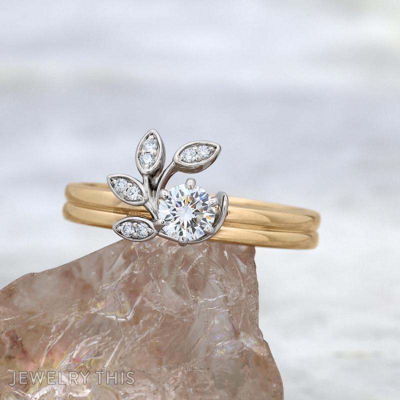This stunning custom ring beautifully honors a cherished family heirloom, thoughtfully reimagined with modern craftsmanship. Crafted in radiant 14k yellow gold, the design features dual bands symbolizing enduring unity, while the elegant white gold setting showcases a brilliant round center diamond elevated by gracefully taller prongs, reminiscent of vintage 70’s style. Delicate crescent-shaped details adorned with eight sparkling baguette and round diamonds artfully mimic the original’s nature-inspired motif, capturing the essence of moonlit leaves.