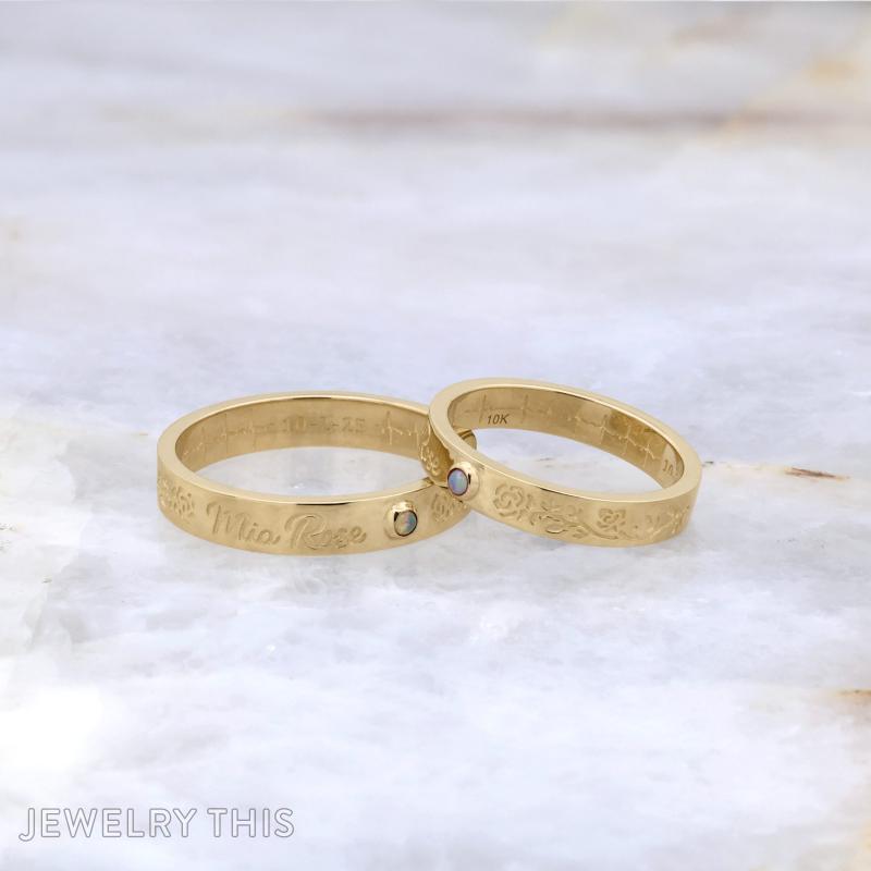 This poignant set of yellow gold bands was lovingly crafted as a sacred tribute to a precious daughter, honoring a life that, while fleeting, is infinitely cherished. Designed for her parents, each ring features her name, delicately engraved alongside a flowing rose motif—a beautiful nod to her namesake. A single, iridescent opal, her birthstone, is bezel-set into the band, capturing a spectrum of light and memory. The most intimate detail remains hidden against the skin: the interior of each band is engraved with the exact EKG heartbeat of the child, a moving reference to her courageous journey. Alongside the pulse, her birthdate is permanently inscribed, ensuring her rhythm is always felt. More than jewelry, these rings serve as a dignified heirloom of love, resilience, and an unbreakable family bond.
