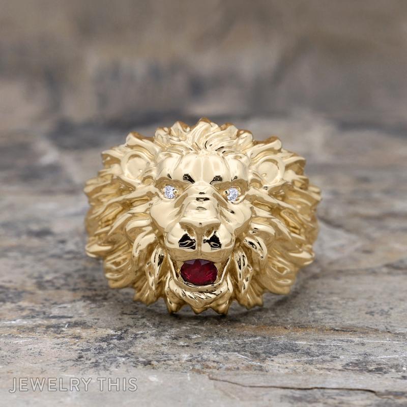 This commanding yellow gold men’s ring is a breathtaking display of sculptural artistry and raw power. Expertly crafted with meticulous detail, the ring features the fierce visage of a lion, with every strand of its flowing mane rendered in high-polished gold. The king of beasts is brought to life with two piercing round diamond eyes that glint with intensity. Adding a bold pop of royal color, a vibrant red ruby is held within the lion’s roaring mouth, symbolizing strength and passion. With its heavy, solid gold construction and intricate textures, this statement piece is a timeless symbol of leadership and courage.