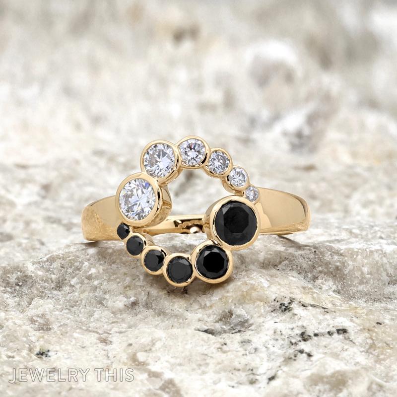 This striking yellow gold engagement ring is a beautiful exploration of harmony and contrast. At its center, a perfect circle is artfully formed by a series of graduated round bezel settings. One half of this celestial sphere is adorned with brilliant white diamonds, while the opposing side features deep, mysterious black diamonds, seamlessly mimicking the iconic Yin-Yang symbol. The settings gently transition in size, creating a sense of fluid movement and eternal balance. This intricate focal point is balanced by a sleek, solid band that meets the center with clean lines, ensuring the symbolic duality remains the star of the piece.